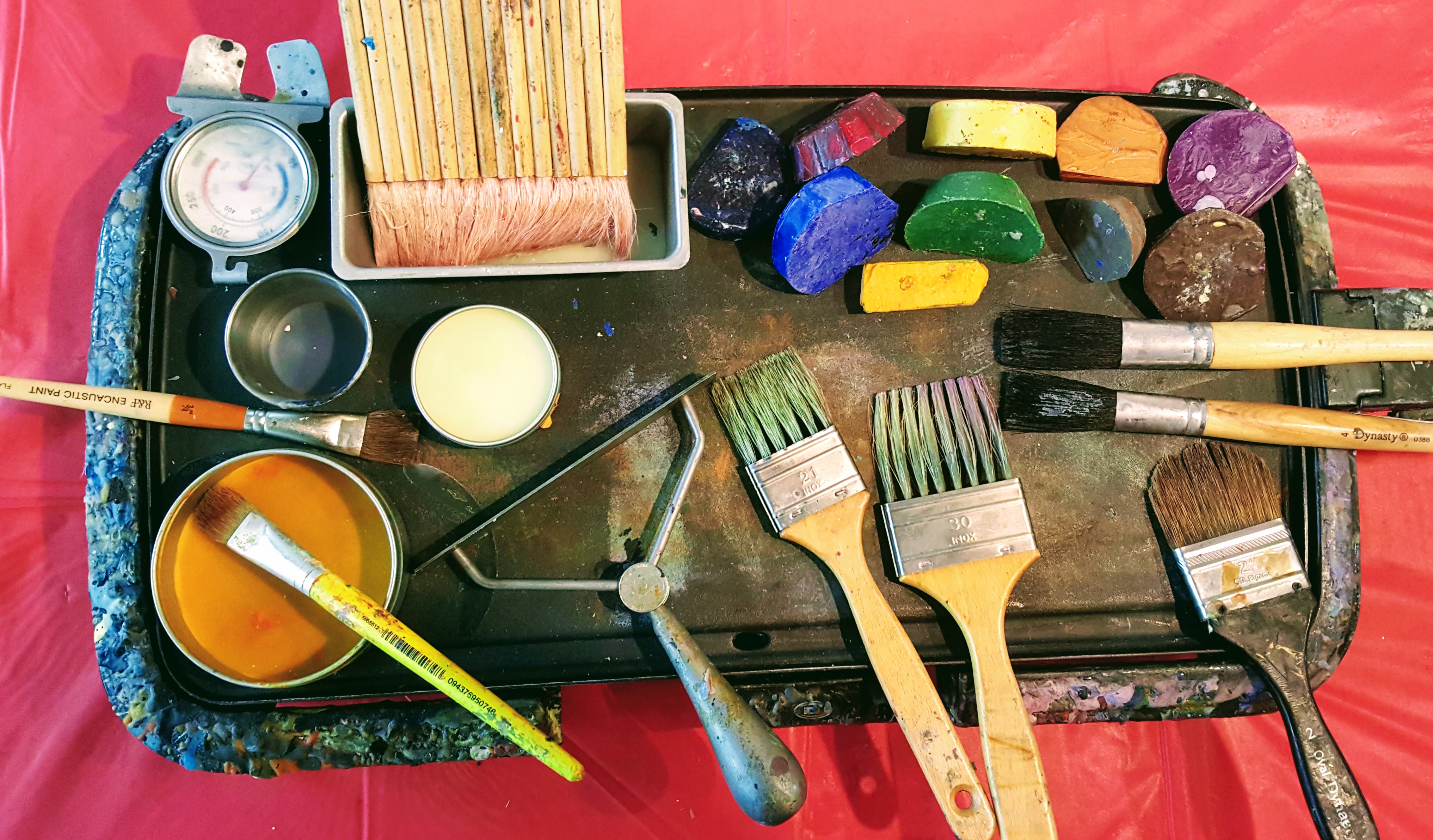 Encaustic painting is an ancient painting technique that has resurfaced in recent times as a modern art medium. Encaustic paint is composed of pure beeswax, pigment and damar resin and formed into molded shapes such as cakes or bars. To be used, it is then melted using a hot plate and heat gun and applied to the surface using heated brushes and other molding tools.